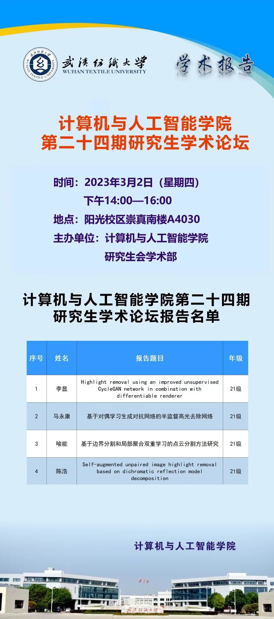 学术预告:第202期研究生学术论坛暨计算机与人工智能学院2023年第1期研究生学术论坛